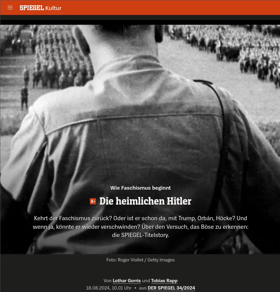 Und weil sich der SPIEGEL offenbar über jeden moralischen Zweifel erhaben wähnt, titelt das Magazin dann selbst „Die heimlichen Hitler“ und bezieht sich dabei auf Trump, Orbán und Höcke.