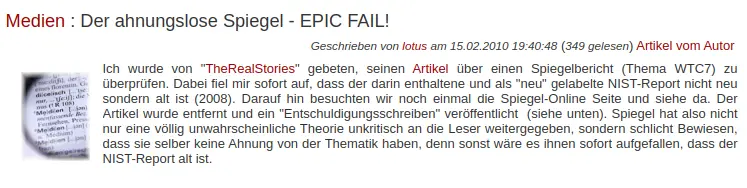 Der SPIEGEL verbreitet natürlich keine Verschwörungsgeschichten, sondern nur Fakten. Das habe ich zumindest gelesen, als ich im Irak in Begleitung von amerikanischen Hinrichtungstouristen nach Massenvernichtungswaffen gesucht habe...ehm....oh.