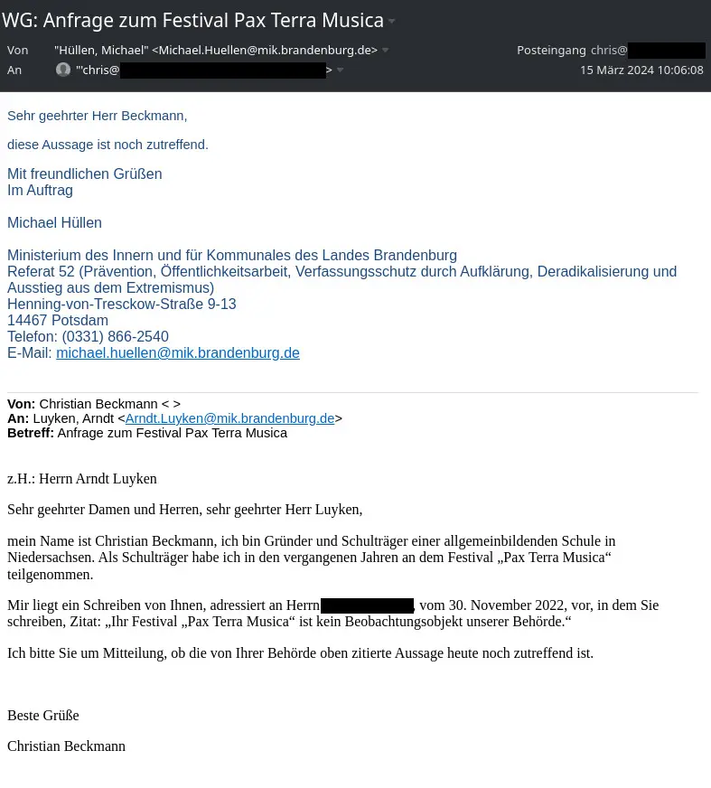 Also, warum genau befasst sich der Verfassungsschutz mit dem Festival? Ich möchte es genau wissen und forsche nach. Zunächst erhalte ich ein vertrauliches Schreiben aus dem hervorgeht, dass der Verfassungsschutz sich nicht mit dem Festival befasse. Dies steht im Widerspruch zu den Aussagen der Leitmedien. Ich wende mich selbst an den Verfassungsschutz und frage nach. Hier der Briefwechsel: