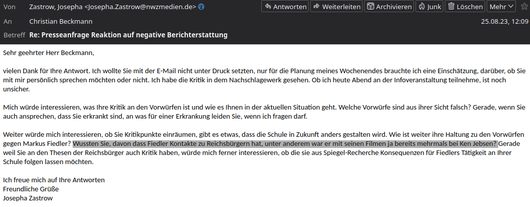 Frau Zastrow von der Nordwest-Zeitung kontaktierte mich als Arbeitgeber mit entsprechenden Nachfragen zum SPIEGEL-Artikel.
