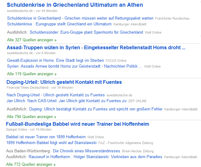 Über die News-Funktion der Suchmaschine „Google“ können wir uns die Quellenanzahl zu aktuellen Nachrichten anzeigen lassen(Anmerkung: diese Funktion gibt es heute nicht mehr...). Hier ein kleiner Auszug: